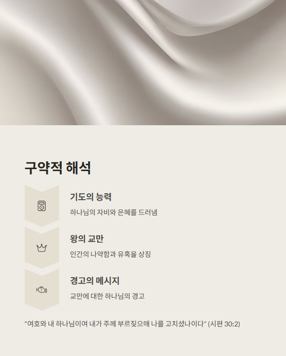 구약은 기도를 통한 하나님의 은혜와 인간의 교만으로 인한 경고를 강조합니다. 히스기야의 병 고침은 하나님의 자비와 은혜를 드러내고, 바벨론 사자 앞에서의 교만은 인간의 나약함과 유혹을 상징합니다.