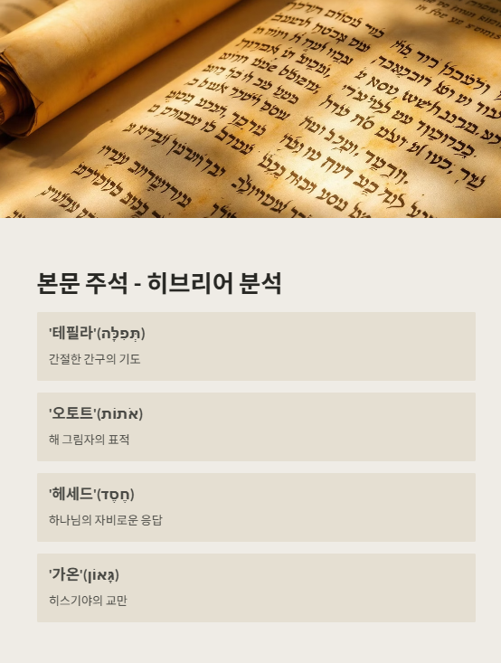 - 'חֶסֶד'(헤세드): ‘은혜, 자비’ – 하나님의 자비로운 응답