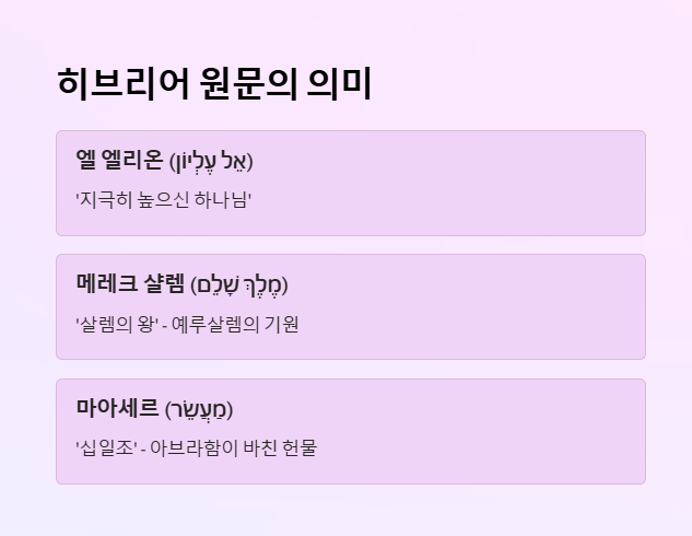 - '메레크 샬렘' (מֶלֶךְ שָׁלֵם) – ‘살렘의 왕’이라는 뜻으로, 이는 예루살렘의 기원을 의미할 가능성이 큽니다.