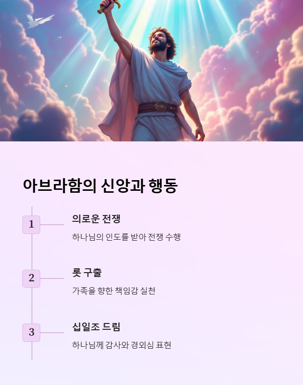 아브라함은 단순한 군사 지도자가 아니라, 하나님의 인도를 받아 의로운 전쟁을 수행합니다. 이는 하나님의 도우심을 신뢰하는 신앙을 보여줍니다.