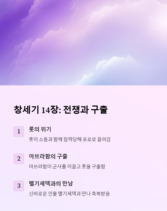 창세기 14장은 고대 근동의 전쟁과 아브라함(당시 아브람)의 신앙적 결단을 다루고 있습니다. 롯이 소돔과 함께 침략당하여 포로로 끌려가자, 아브라함은 군사를 이끌고 롯을 구출합니다. 이후 아브라함은 신비로운 인물인 멜기세덱을 만나 축복을 받고, 십일조를 드립니다. 이 장은 신앙의 실천과 예수 그리스도의 예표로서 멜기세덱이 등장하는 중요한 장면을 포함하고 있습니다.