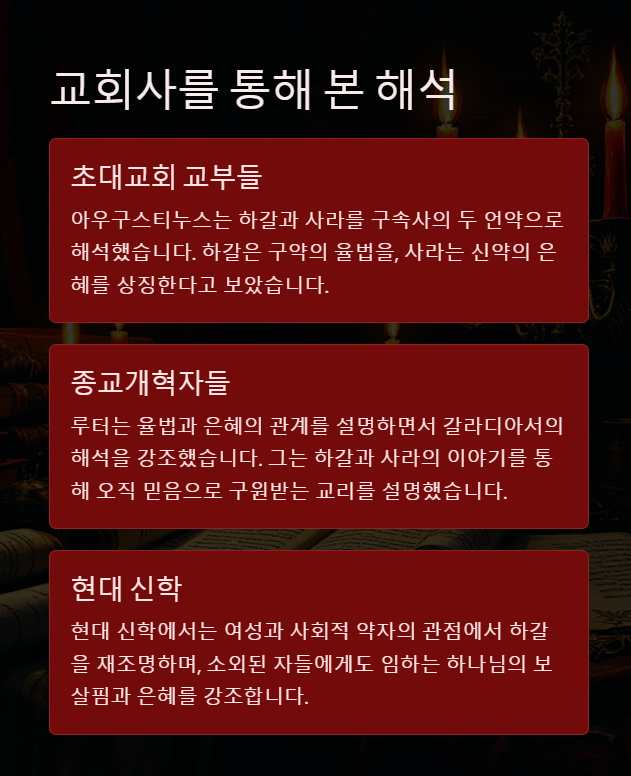 - 아우구스티누스는 하갈과 사라를 구속사의 두 언약으로 해석했습니다.