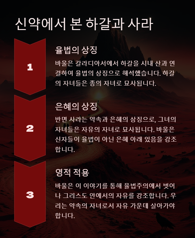 바울은 율법의 자녀(하갈)와 은혜의 자녀(사라)를 대비하며, 신자는 자유로운 약속의 자녀로 살아가야 한다고 강조합니다.
