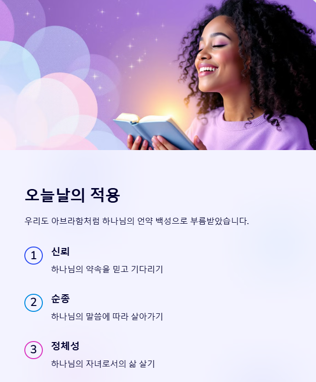 우리도 하나님의 언약 백성으로 부름을 받았습니다. 아브라함처럼 하나님을 신뢰하며, 믿음으로 살아가야 합니다.