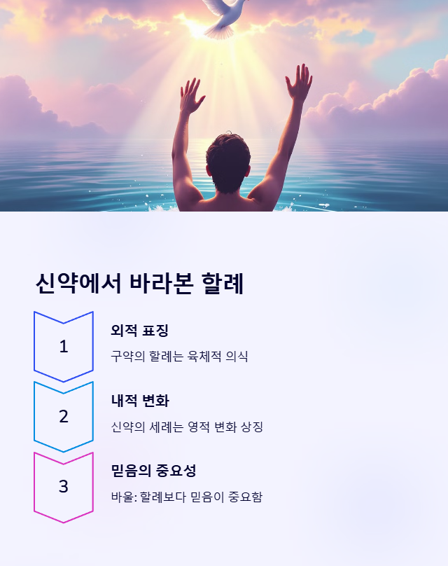 신약에서는 할례가 외적인 표징이지만, 세례는 내적인 변화와 관련이 있다고 설명됩니다. **골로새서 2:11-12**에서 바울은 이를 비교합니다.