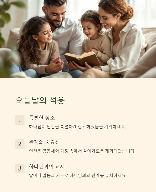 창세기 2장은 우리에게 하나님이 인간을 특별하게 창조하시고, 관계 속에서 살아가도록 계획하셨음을 보여줍니다. 인간은 홀로 존재하도록 창조되지 않았으며, 공동체와 가정 속에서 사랑과 섬김을 실천해야 합니다. 또한, 하나님과의 관계가 단절되지 않도록 날마다 말씀과 기도로 나아가야 함을 가르쳐줍니다.