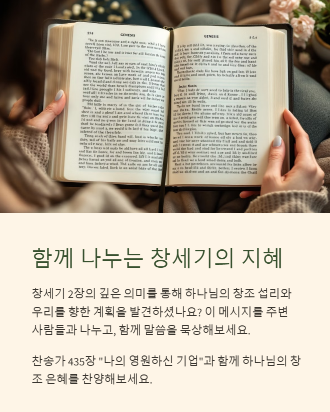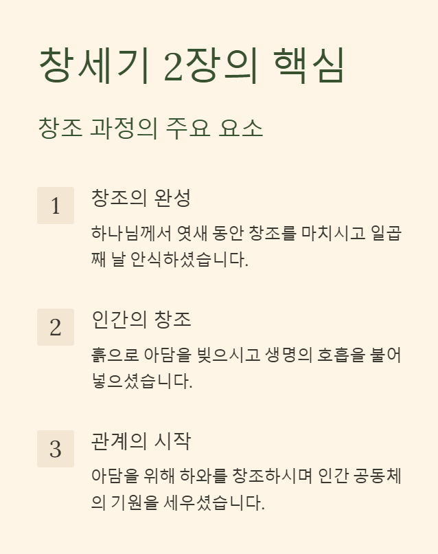 창세기 2장은 창조 이야기의 확장된 설명을 제공합니다. 하나님께서 엿새 동안 창조를 마치시고 일곱째 날 안식하셨으며, 아담을 창조하시고 그를 위해 에덴동산을 마련하셨습니다. 그리고 아담이 홀로 있는 것이 좋지 않다고 여기시어 하와를 창조하셨습니다. 이는 인간 공동체의 시작과 결혼의 기원을 설명하는 중요한 본문입니다.