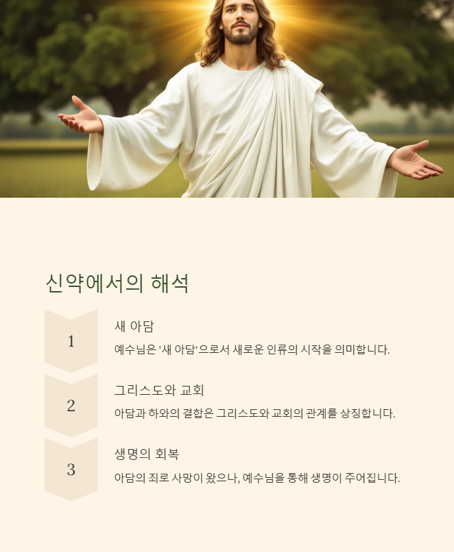 사도 바울은 예수님을 ‘새 아담’이라고 언급하며(고린도전서 15:45), 첫 아담이 죄를 통해 타락했지만, 예수 그리스도를 통해 새로운 인류가 시작된다고 설명합니다.