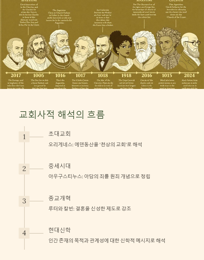 • 루터와 칼빈은 창세기 2장을 인간 본성의 타락 이전 상태를 설명하는 중요한 텍스트로 보았으며, 아담과 하와의 결혼을 신성한 제도로 강조했습니다.