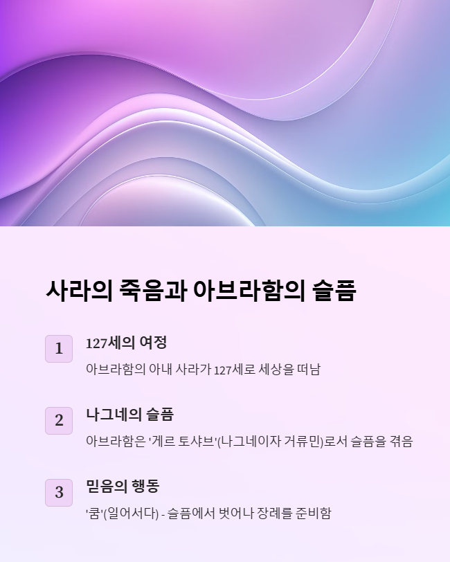 창세기 23장은 아브라함의 아내 사라가 127세의 나이로 세상을 떠나는 장면을 기록하고 있습니다. 아브라함은 사라를 위해 가나안 땅에서 막벨라 굴을 정식으로 매입하여 장사지냅니다. 이는 하나님께서 약속하신 가나안 땅을 실제로 소유하는 첫 사건으로, 이스라엘 민족의 정착을 예고하는 중요한 의미를 가집니다.