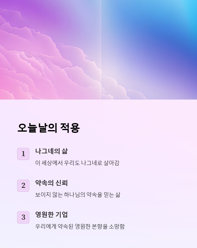 우리도 이 땅에서 나그네와 같은 삶을 살아가지만, 결국 하나님께서 영원한 기업을 약속하셨음을 믿어야 합니다. 또한, 믿음의 조상들이 걸어간 길을 본받아 하나님의 약속을 신뢰하는 삶을 살아야 합니다.