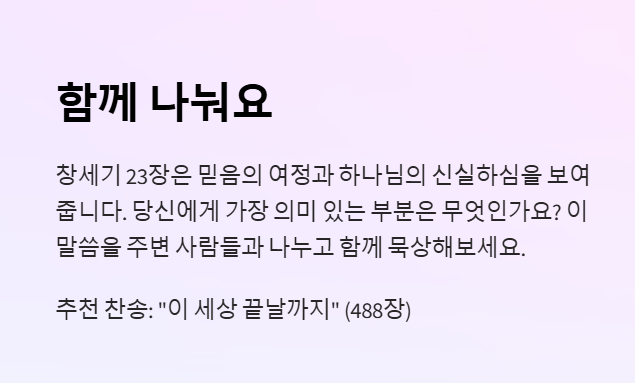 사라의 죽음과 장례는 결국 성도들이 바라보아야 할 최종적인 약속, 새 하늘과 새 땅(계시록 21:1)과 연결됩니다.