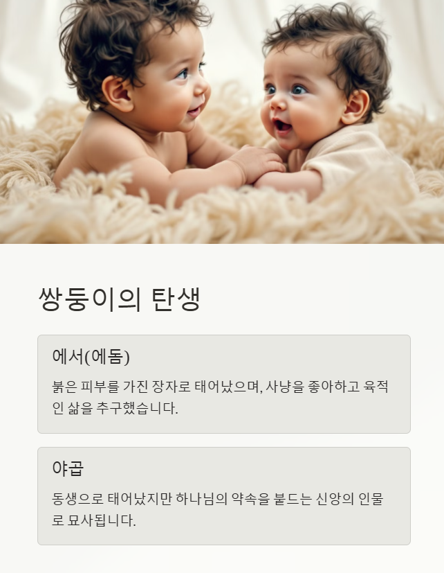 에서는 장자로 태어났지만, 하나님께서는 야곱을 선택하십니다. 이는 하나님의 선택이 인간의 조건이 아니라 하나님의 뜻에 따른 것임을 보여줍니다.