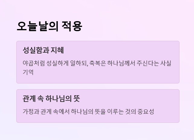 우리의 삶 속에서도 야곱처럼 성실함과 지혜로 일하지만, 궁극적인 축복은 하나님께서 주신다는 사실을 기억해야 합니다. 또한, 가정과 관계 속에서 하나님의 뜻을 이루는 것이 중요함을 배울 수 있습니다.
