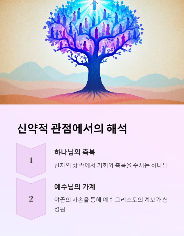 야곱의 자손을 통해 이스라엘 민족이 형성되며, 궁극적으로 예수 그리스도가 탄생하는 계보의 중요한 일부가 됩니다.