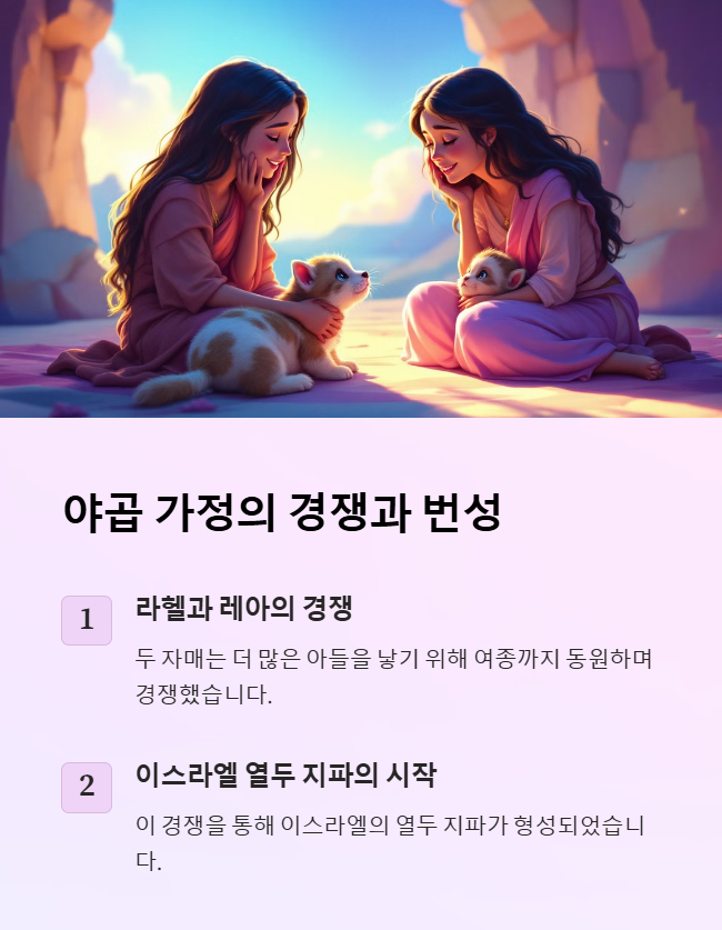 라헬과 레아는 서로 더 많은 아들을 낳기 위해 여종까지 동원하며 경쟁합니다. 이는 인간적인 욕심 속에서도 하나님의 계획이 이루어지는 과정을 보여줍니다.