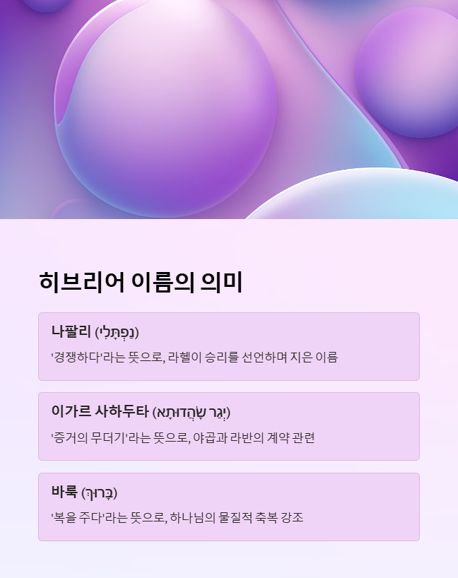 - '나팔리' (נַפְתָּלִי) – ‘경쟁하다’라는 뜻으로, 라헬이 자신의 경쟁 속에서 승리를 선언하며 아들의 이름을 지음.