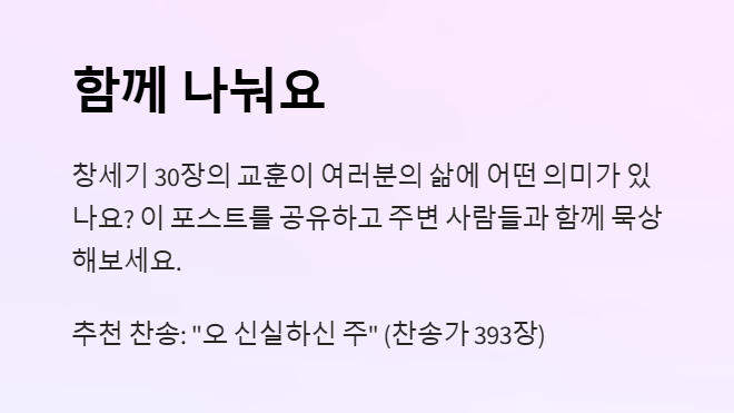 창세기 30장은 야곱의 가족이 번성하는 과정과 하나님께서 그를 축복하시는 장면을 기록하고 있습니다. 라헬과 레아의 경쟁적인 출산과 함께, 야곱이 라반의 집에서 가축을 번성시키는 과정이 등장합니다. 하나님께서는 야곱의 지혜와 인내를 통해 그의 재산을 크게 불려 주십니다.