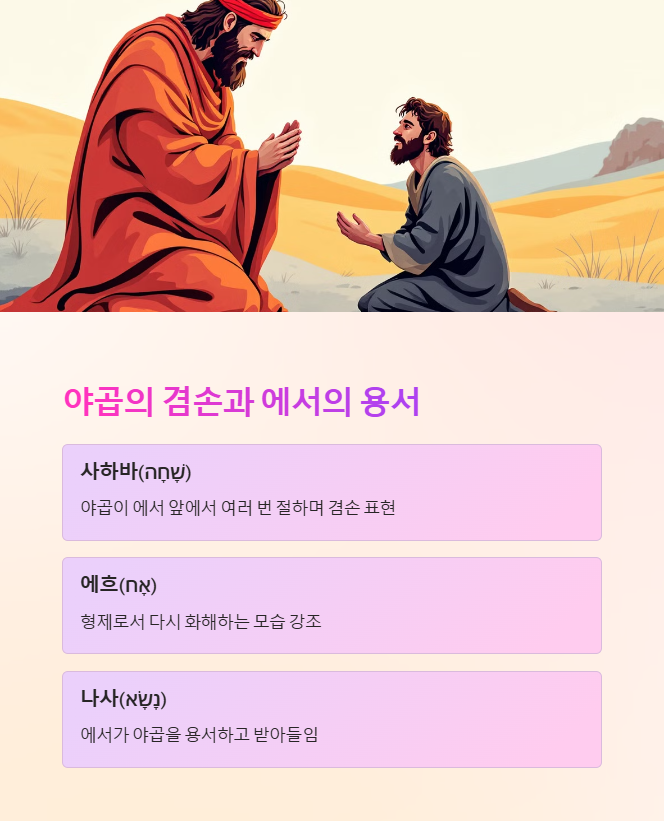 • '사하바' (שָׁחָה) – ‘몸을 굽히다’라는 뜻으로, 야곱이 에서 앞에서 여러 번 절하며 겸손을 표현함.