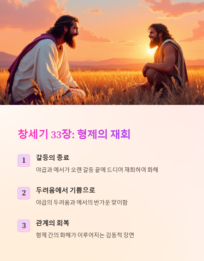 창세기 33장은 야곱과 에서가 오랜 시간의 갈등 끝에 드디어 재회하여 화해하는 장면을 기록하고 있습니다. 야곱은 두려움 속에서 형을 만나지만, 에서는 그를 반갑게 맞이하며 형제의 화해가 이루어집니다.