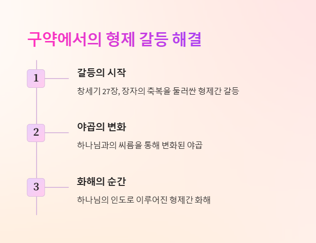 우리도 야곱과 에서처럼 갈등을 해결하고, 서로를 용서하는 삶을 살아야 합니다. 하나님께서 우리 삶 속에서 관계를 회복시키시는 분임을 신뢰해야 합니다.
