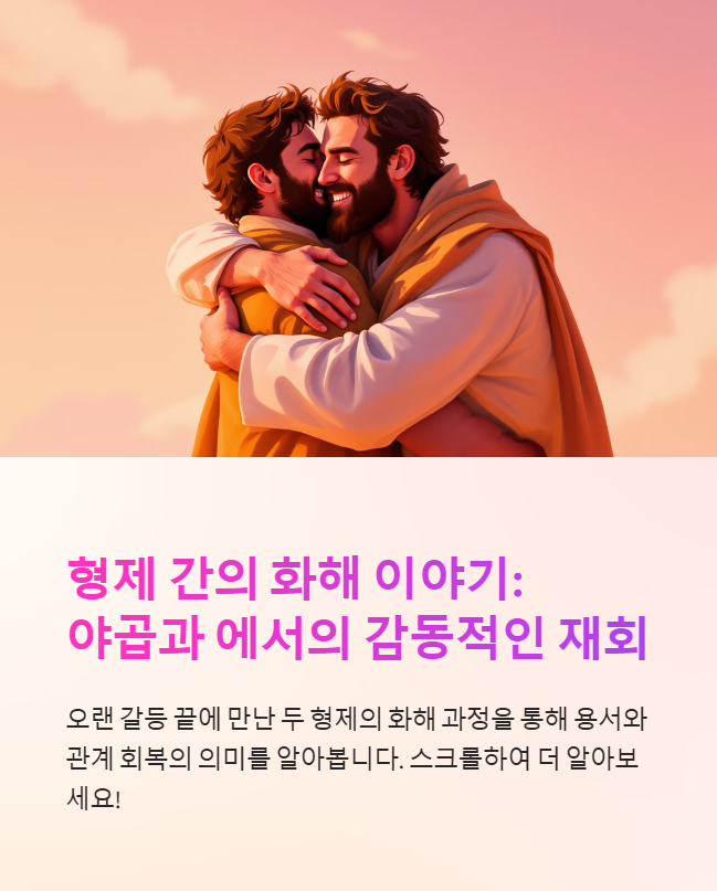 야곱은 형에게 자신을 낮추며 사과하는 태도를 보였고, 에서는 이를 기쁘게 받아들였습니다. 이는 하나님의 개입하심 속에서 형제의 관계가 회복되는 과정입니다.