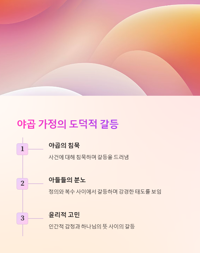 야곱은 사건에 대해 침묵하지만, 그의 아들들은 정의와 복수 사이에서 갈등하며 세겜 족속을 학살하는 강경한 태도를 보입니다.