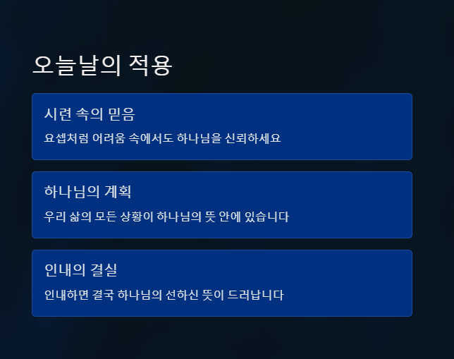 우리도 요셉처럼 하나님의 계획 속에서 시련을 겪을 수 있습니다. 그러나 하나님께서 신실하게 인도하심을 믿고 나아갈 때, 모든 것이 하나님의 뜻 가운데 이루어질 것입니다.