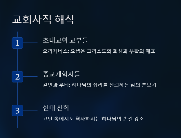 - 오리게네스는 요셉의 고난과 구원을 그리스도의 희생과 부활의 예표로 해석했습니다.