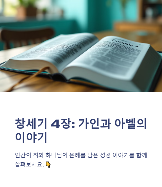 창세기 4장은 가인과 아벨의 이야기로, 인간의 죄가 개인적인 범죄로 확대되는 과정을 보여줍니다. 가인은 아벨을 시기하여 살해하고, 하나님께 벌을 받지만 동시에 보호의 표를 받습니다. 이 장은 하나님의 공의와 은혜가 함께 작용하는 모습을 보여줍니다.