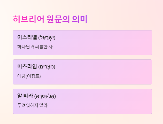 • '미츠라임' (מִצְרַיִם) – ‘애굽(이집트)’이라는 뜻으로, 이스라엘 백성이 정착할 땅.