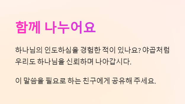 야곱처럼 우리도 인생의 결정 앞에서 하나님의 인도를 구해야 하며, 두려워하지 말고 하나님의 약속을 신뢰해야 합니다.
