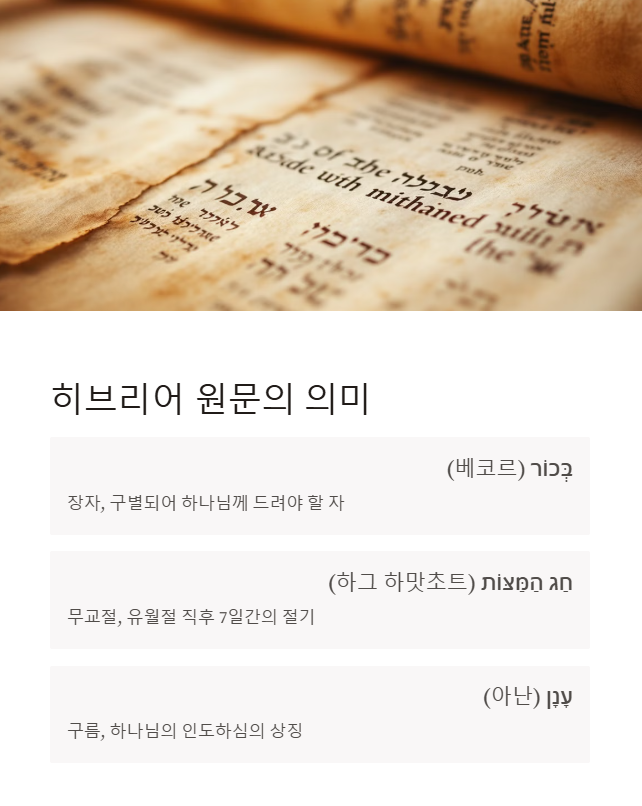 출애굽기 12장 주석 - 유월절과 이스라엘의 출애굽 📍 설교 자료 다운로드 👉 📍 성경 구절 PPT 다운로드 👉 목차출애굽기 12장 개요본문 주석 – 유월절과 첫째 아들의 죽음히브리어 원문 분석