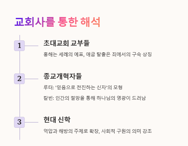 - 교부들은 홍해를 세례의 예표로 보며, 애굽에서의 탈출은 죄에서의 구속을 상징한다고 해석했습니다.
