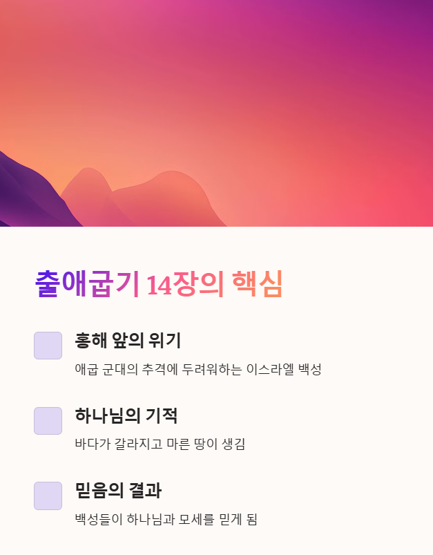 출애굽기 14장은 이스라엘 백성이 홍해 앞에 이르러 하나님의 놀라운 기적으로 바다를 건너는 사건을 중심으로 전개됩니다. 애굽 군대의 추격 앞에서 두려워하던 백성은, 하나님의 권능을 직접 목격하고 하나님과 모세를 믿게 됩니다.