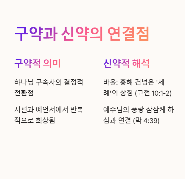 - 바울은 **고린도전서 10:1–2**에서 이스라엘이 홍해를 건넌 사건을 ‘세례’에 비유합니다.