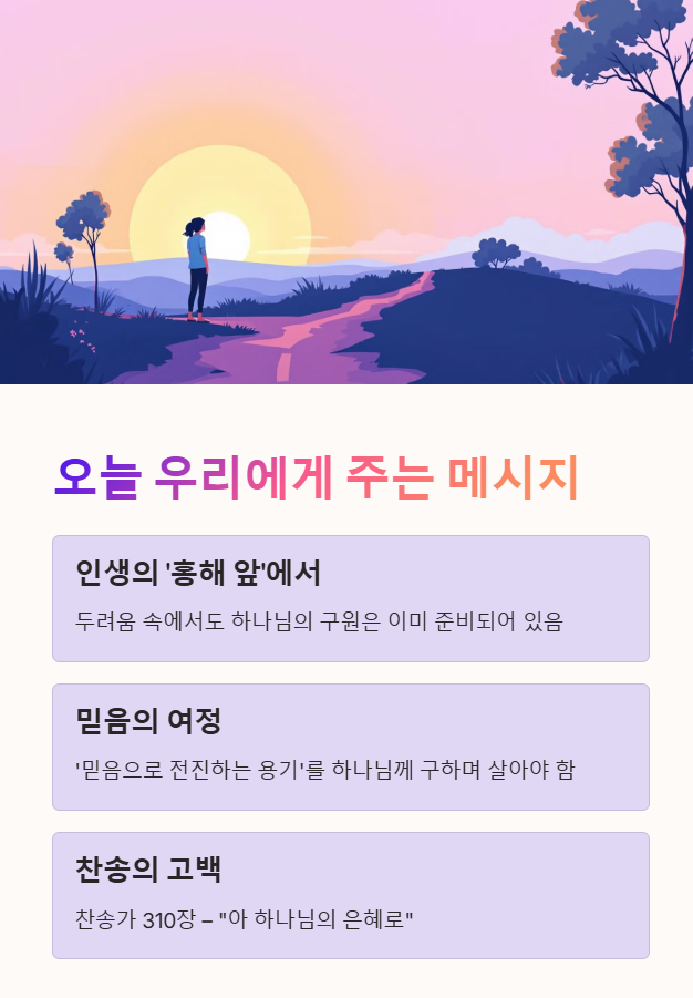 우리는 인생의 ‘홍해 앞’에서 두려워할 때, 하나님의 구원은 이미 준비되어 있다는 것을 믿어야 합니다. 또한, 신앙의 여정 속에서 ‘믿음으로 전진하는 용기’를 하나님께 구하며 살아야 합니다.