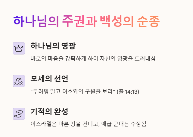 - 하나님은 바로의 마음을 강퍅하게 하여 추격하게 하시고, 자신의 영광을 드러내십니다.