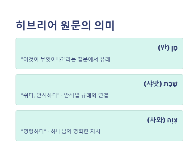 - 'מָן' (만) – ‘만나’라는 뜻으로, “이것이 무엇이냐?”라는 질문에서 유래.