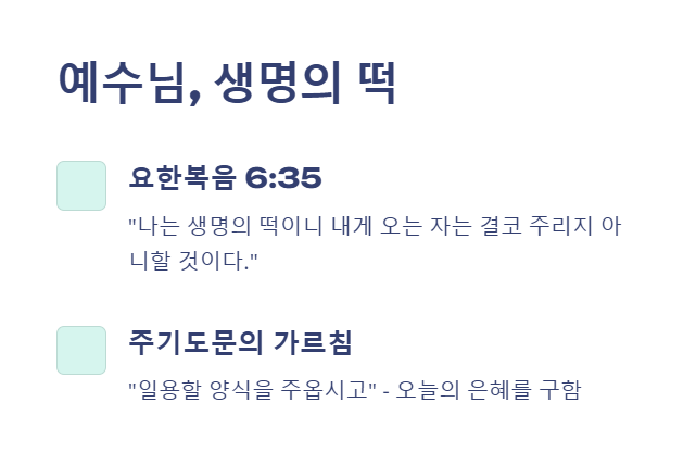 - 주기도문에서 예수님은 **“일용할 양식을 주옵시고”**라고 기도하라고 가르치셨습니다.