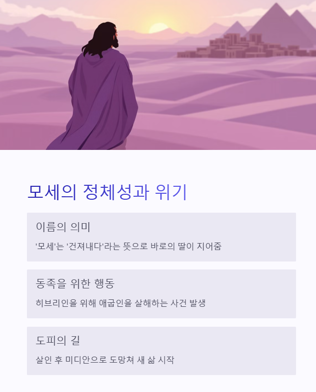 - 모세는 애굽의 왕자로 자랐지만, 동족 히브리인을 위해 행동하다가 애굽인을 살해하고 도망치게 됩니다.