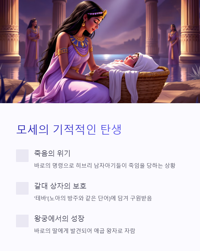 - 하나님은 모세를 갈대 상자를 통해 보호하시고, 바로의 궁정에서 성장하도록 인도하십니다.