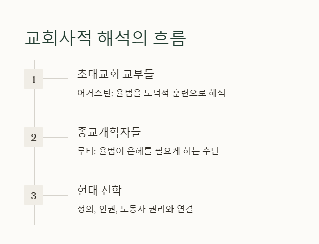 - 어거스틴은 율법의 사회적 측면을 도덕적 훈련으로 해석하며, 신자의 내면의 성결로 연결했습니다.