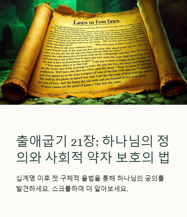출애굽기 21장은 십계명 이후 처음 등장하는 구체적 율법 조항들로, 특히 사회적 약자인 종, 피해자, 여성에 대한 보호를 중심으로 한 정의와 책임의 법률을 다룹니다. 이는 공동체 내에서의 질서와 공의, 하나님의 마음을 반영하는 규례들입니다.