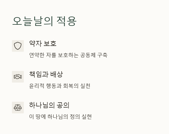 우리 사회에서도 연약한 자를 보호하고, 상처받은 자를 회복시키는 정의로운 공동체를 세우는 것이 중요합니다. 또한, 책임 있는 행동과 배상의 윤리를 실천하며, 하나님의 공의를 이 땅에 실현해야 합니다.