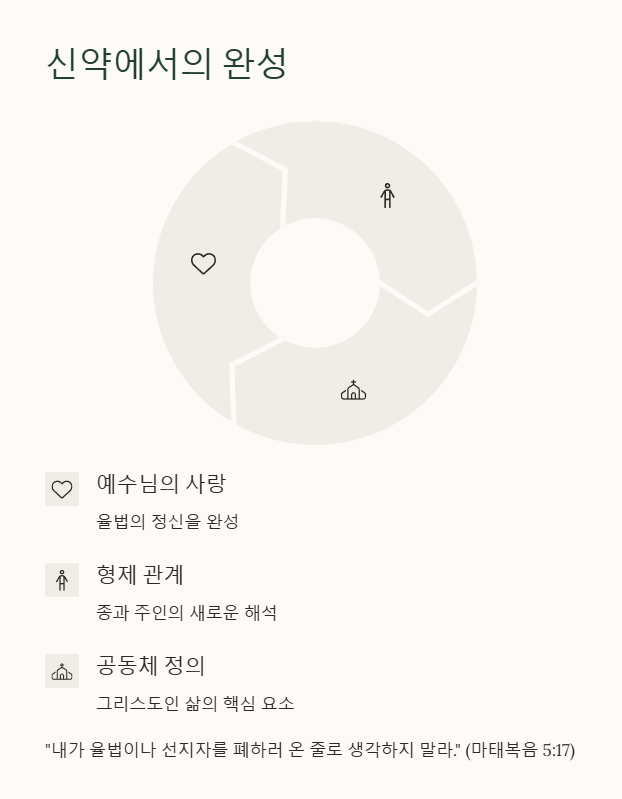 - 예수님은 율법의 정신, 곧 사랑과 자비를 통해 법의 근본을 완성하셨습니다.