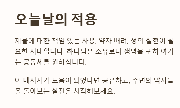 이 시대에도 우리는 재물에 대한 책임 있는 사용, 약자에 대한 배려, 공동체 질서를 위한 정의 실현의 필요성을 잊지 말아야 합니다. 하나님께서 원하시는 사회는 강자가 약자를 배려하고, 소유보다 생명을 귀히 여기는 공동체입니다.