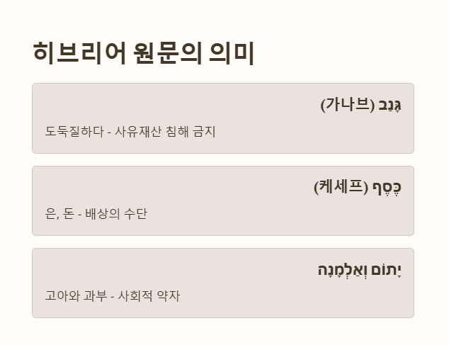 • 'גָּנַב' (가나브) – ‘도둑질하다’라는 뜻으로, 사유재산에 대한 침해를 금지.