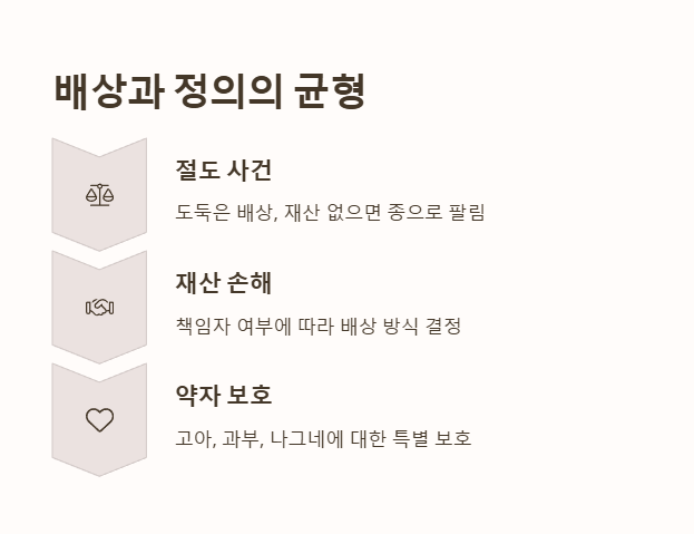• 절도 사건에서는 도둑이 배상을 하되, 재산이 없으면 자신이 종으로 팔리게 됩니다.