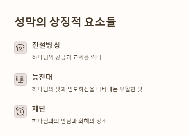 - 등잔대는 하나님의 빛과 인도하심을 나타내며, 성소 안을 밝히는 유일한 빛이었습니다.